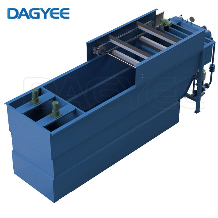 La DAF est conçue avec une grande surface, est particulièrement adaptée à traiter des eaux d'égout avec un grand volume de boue de flottaison. L'eau de processus qui est des floculants par le système de floculants alors dirigé vers le réservoir de DAF. Les eaux à traiter à traiter sont mélangées avec de l'eau “laiteux”, une émulsion des millions de bulles micro sont produites quand la pression de l'eau saturée par air est soudainement libérée. Jusqu'à 25^30% de l'effluent est recyclé pour la génération de l'eau de pression par une pompe multi de côté-canal d'étape. Un compresseur alimente l'air au rotor de pompe qui produit des bulles de micron avec une grande surface pour la saturation de l'eau. L'eau avec de l'air est accomplie dans un tube de réacteur passent alors dans la cellule de flottaison par la valve de version de pression. Seulement le dessus de la partie de cette boue concentrée est écrémé pour déschlammer le compartiment. Le système d'écumoire de boue est construit avec de la chaîne et du type plat d'acier inoxydable de bride tenant un essuie-glace en caoutchouc flexible et semi-rigide. La boue dans le réservoir de boue par gravitation a augmenté l'asséchage.
