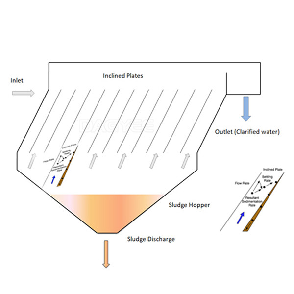 Le format de l'épurateur incliné de l'eau de sédimentation de plat est d'installer un 60° a incliné le tuyau au-dessus de la couche de suspension de boue. En ajoutant le floculant à la boue, les solides ou les fleurs floconneuses suspendus d'alun s'accumulent dans la boue mince, et puis sous le tuyau incliné dans le secteur superficiel, les glissières de couche de suspension de boue de nouveau à se fondent sur la gravité, et puis arrangent dans la trémie de collection de boue, et sont déchargées dans le réservoir de boue par le tuyau de boue pour le traitement séparé ou l'utilisation complète. Le surnageant se lève graduellement dans le tuyau de collection pour la décharge ou la réutilisation.